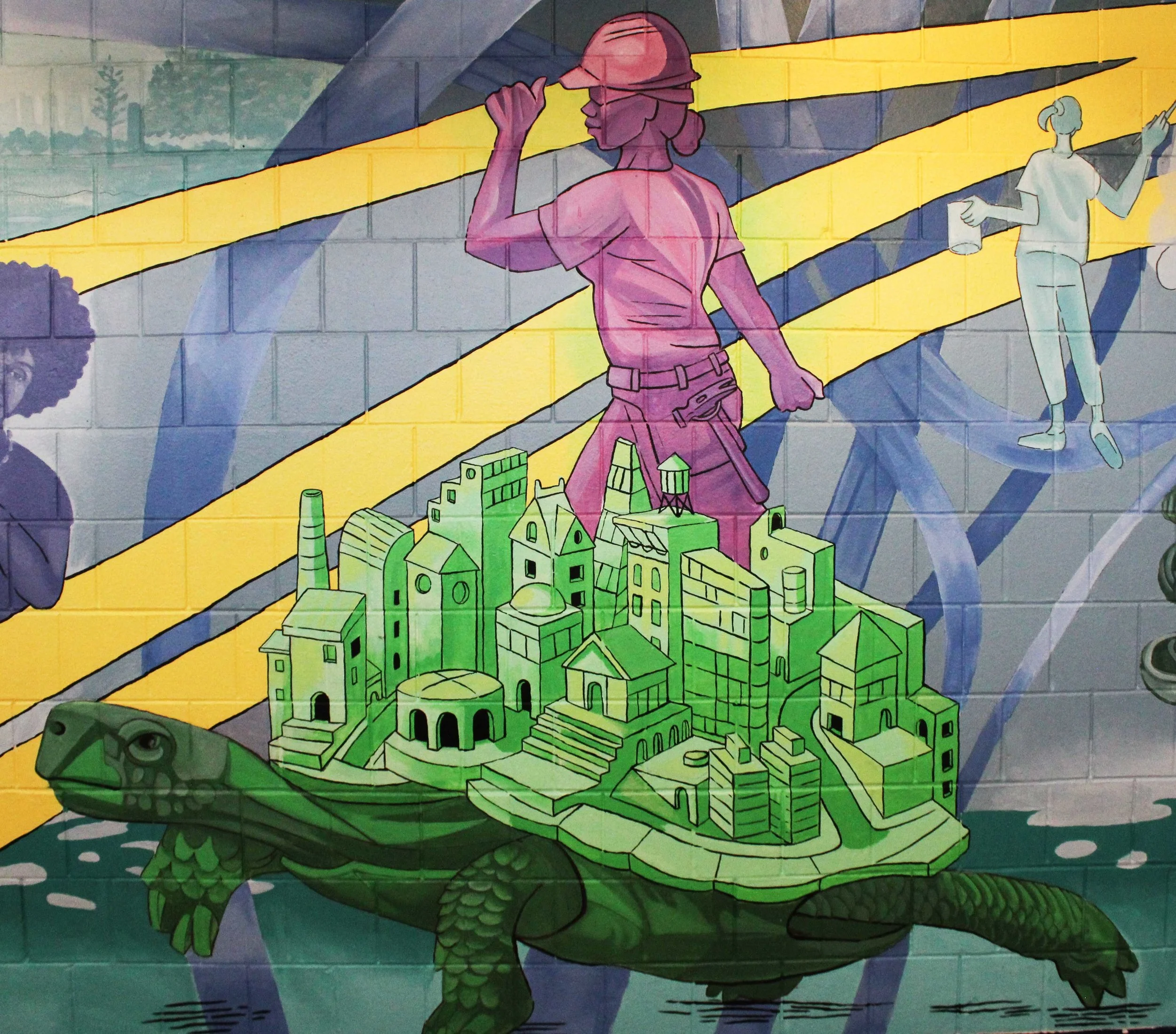 The black and white drawing is the original design that was approved by the board of the Institute. They provided a grant for the materials and installation of the mural.